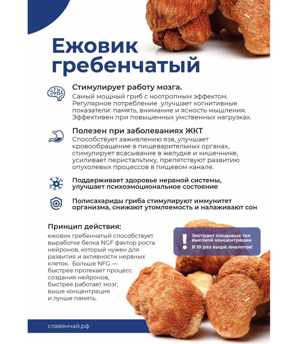 Самый мощный гриб с ноотропным эффектом! Стимулирует работу мозга, регулярное потребление ежовика гребенчатого улучшает когнитивные показатели: память, внимание и ясность мышления. Эффективен при повышенных умственных нагрузках.