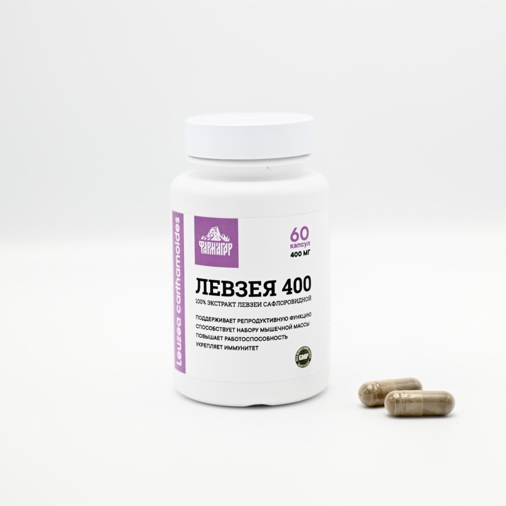 1 капсула содержит 400мг водорастворимого экстракта Левзеи сафлоровидной.
